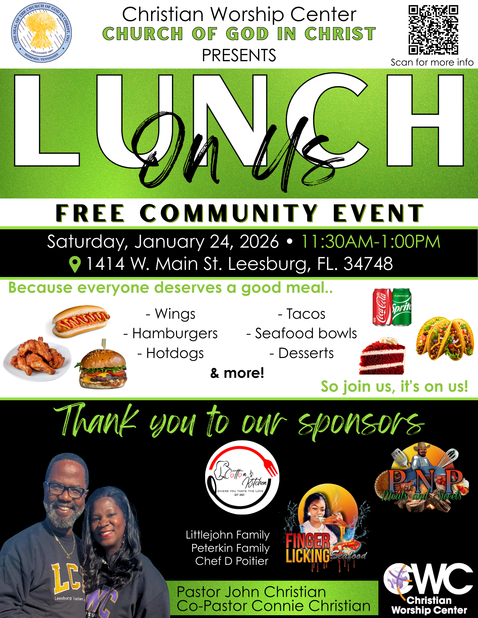 Lunch on Us is a free community event created to share good food, fellowship, and care with our neighbors. On January 24, 2026, we invite you to join us for a delicious meal prepared by local vendors who are coming together to serve the community with love.